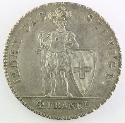 Rs.: In Strichelkreis Umschrift: «IEDEM DAS – SEINIGE .». Auf Bodenleiste stehender Krieger nach rechts blickend, in «altschweizerisch-vaterländischer Tracht» in Anlehnung an die Söldnerkleidung des 16. Jhs. mit geschlitzten Beinkleidern, geschlitztem Wams, Radkragen und Federhut (Freiheitshut, Symbol für die Freiheit), seine rechte Hand umfasst den Griff eines Zweihänder-Langschwerts mit geflammter Klinge und gebogener Parierstange (Symbol der Wehrhaftigkeit und militärischen Stärke). Linker Unterarm auf dem oberen Rand eines spitzen Schweizer Wappenschilds liegend, unter Bodenleiste die Wertangabe «4 . FRANKN[N hochgestellt] :».