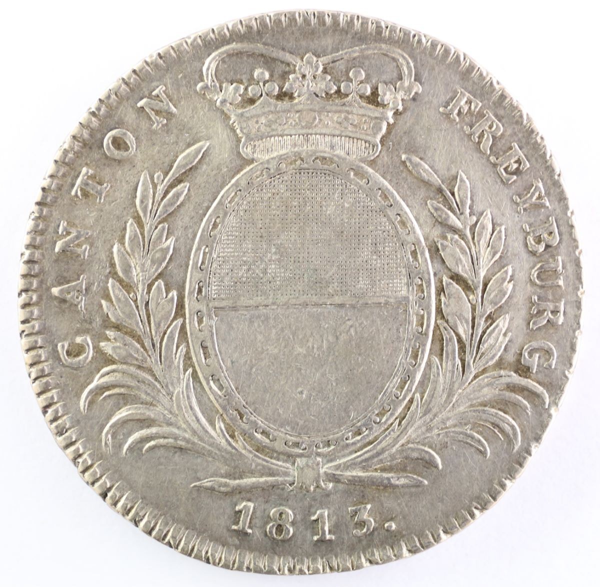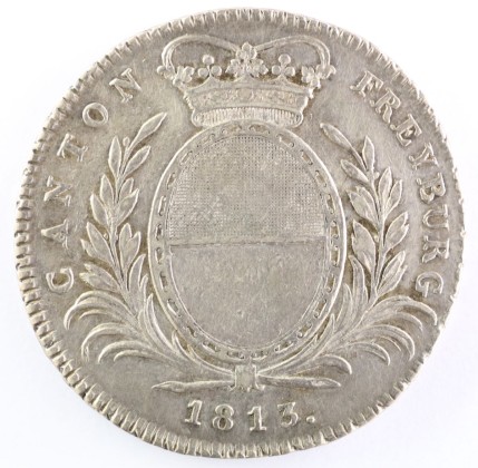 Vs.: In Strichelkreis Umschrift: «CANTON – FREYBURG – 1813 .». Mit Lilienkrone bekröntes Freiburger Wappen in ovalem, von Volutenrapport gerahmtem Schild zwischen Lorbeer- und Palmzweigen (Symbole des Siegs und Ruhms sowie des Friedens), darunter Jahreszahl.