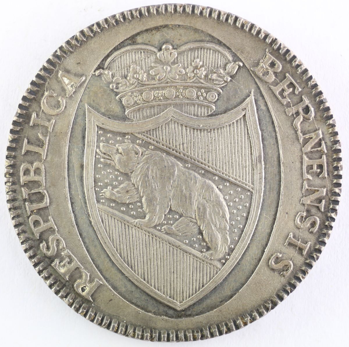 Vs.: Umschrift: «RESPUBLICA – BERNENSIS». In Strichelkreis bekrönter Schild in Schweizer Form mit Berner Wappen (heraldisch nach rechts aufwärtsschreitender Bär mit erhobener linker Vordertatze), in einer ovalen Vertiefung.