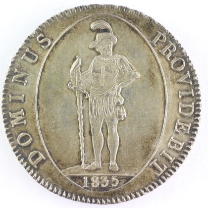Rs.: Umschrift: «DOMINUS – PROVIDEBIT» (Der Herr wird vorsorgen, Gen 22, 8). In Strichelkreis stehender Krieger nach rechts blickend, in «altschweizerisch-vaterländischer Tracht» in Anlehnung an die Söldnerkleidung des 16. Jhs. mit geschlitzten Beinkleidern, geschlitztem Wams, Radkragen und mit Federhut (Freiheitshut, Symbol für die Freiheit) sowie mit seiner rechten Hand ein Zweihänder-Langschwert mit geflammter Klinge und gebogener Parierstange (Symbol der Wehrhaftigkeit und militärischen Stärke) mit der Spitze auf den Boden stellend. Seine Linke in die Taille stützend, darunter die Jahreszahl, in einer ovalen Vertiefung.