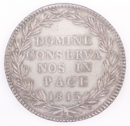 Rs.: In Strichelkreis die Angaben «DOMINE / CONSERVA / NOS IN / PACE [Herr, erhalte uns in Frieden] / 1813» zwischen unten gebundenen Lorbeerzweigen (Symbol des Siegs und Ruhms)., darunter «B», das Zeichen für die Münzstätte Bern.
