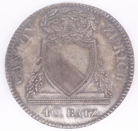 Vs.: Umschrift: «CANTON – ZÜRICH». In Strichelkreis Zürcher Wappen in spitzem, mit Zunge versehenem und auf zweistufigem Podest stehendem Schild, Perlstab entlang des Schildrands und auf Stirnseite der unteren Stufe, Schild flankiert von zwei Eichenzweigen, darüber ein Eichenkranz (Symbol der Stärke, Treue und Einheit), im Abschnitt die Wertangabe «40. BATZ».