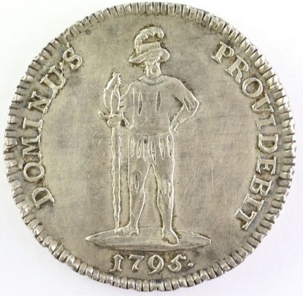 Rs.: Umschrift: «DOMINUS – PROVIDEBIT [Der Herr wird vorsorgen, Gen 22, 8] – 1795.». In Strichelkreis stehender Krieger nach rechts blickend, in «altschweizerisch-vaterländischer Tracht» in Anlehnung an die Söldnerkleidung des 16. Jhs. mit geschlitzten Beinkleidern, geschlitztem Wams, Radkragen und mit Federhut (Freiheitshut, Symbol für die Freiheit) sowie mit seiner rechten Hand ein Zweihänder-Langschwert mit geflammter Klinge und gebogener Parierstange (Symbol der Wehrhaftigkeit und militärischen Stärke) auf den Boden stützend. Seine Linke in die Taille gestützt, auf Wiesengrund stehend.