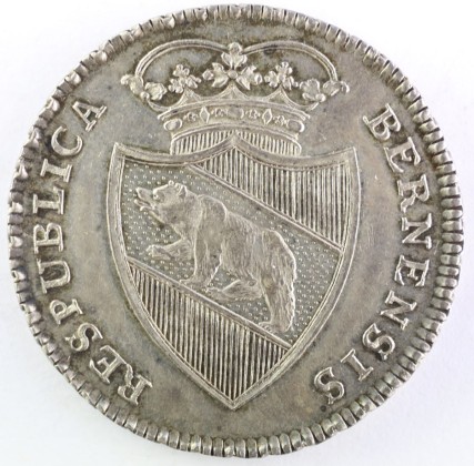 Vs.: Umschrift: «RESPUBLICA – BERNENSIS». In Strichelkreis Berner Wappen (heraldisch nach rechts aufwärtsschreitender Bär mit erhobener linker Vordertatze) im bekrönten Schild in Schweizer Form.