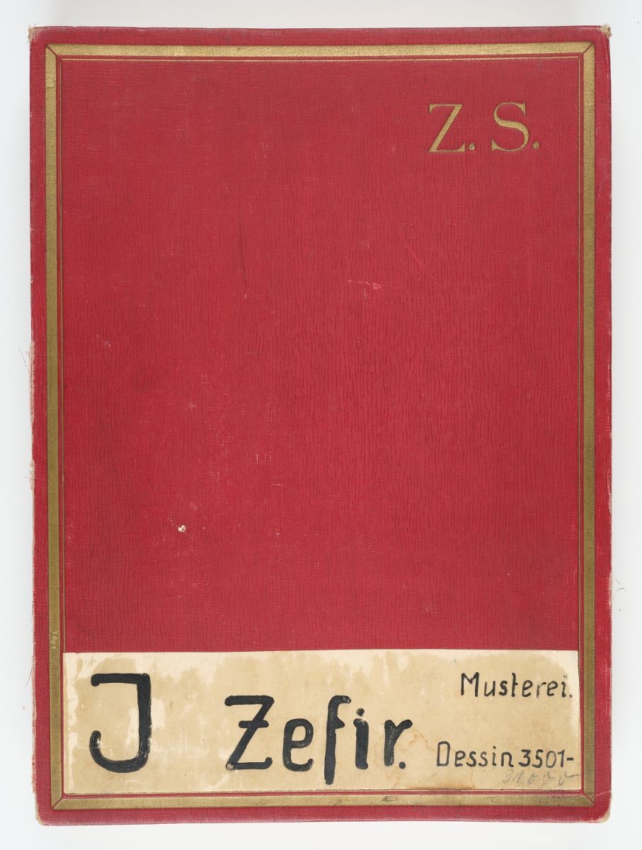 Auf dem Vorderdeckel klebt unten eine weisse, handbeschriebene Etikette: «J, Zefir.» (Mustersorte), «Dessin 3501–31000» (Musternummer) und «Musterei.» (Abteilung).