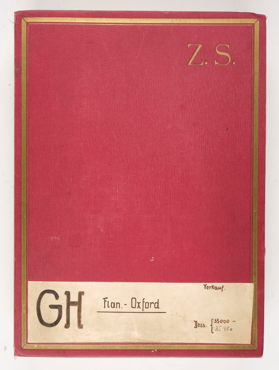 Auf dem Vorderdeckel klebt unten eine weisse, handbeschriebene Etikette, darauf «GH» (hausinterne Identifikation), «Flan.- Oxford» (Mustersorte), «Dess. 35000–35980» (Musternummer) und «Verkauf.» (Abteilung).