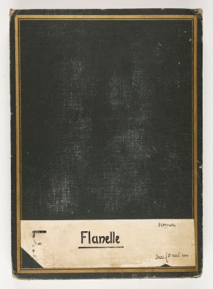 Hochformatiger Leporello (Faltbuch) mit Kartondeckeln, die mit schwarzem Lederimitat auf den Aussenseiten überzogen sind. Aussenseite des Vorder- und Hinterdeckels je mit einer goldgeprägten vertieften Kartusche entlang des Rands versehen. Auf dem Vorderdeckel klebt unten eine weisse, handbeschriebene Etikette, darauf «F» (hausinterne Identifikation), «Flanelle» (Mustersorte), «Ferggerei» (Abteilung), und «Dess. {Broché 2001» (Musternummer).