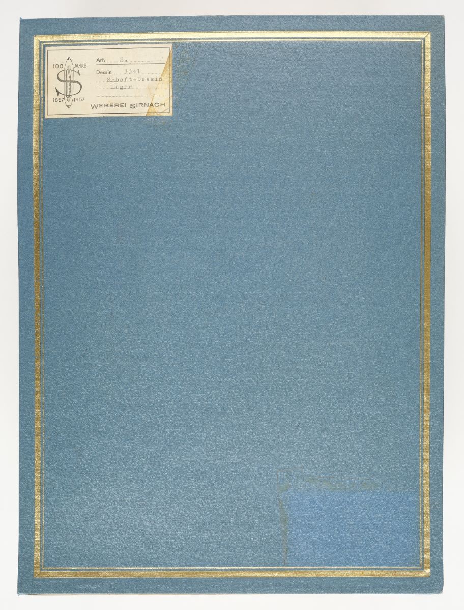 Auf dem Vorderdeckel klebt oben links eine weisse, bedruckte Etikette mit dem Logo der Weberei, der Buchstabe S vor einem Weberschiffchen mit Jubiläumsschriftzug «100 Jahre 1857–1957». Darauf geschrieben «Art. S» (hausinterne Identifikation), «Dessin 3341» (Musternummer), «Schaft–Dessin» (Musterangabe), «Lager» (Abteilung), «WEBEREI SIRNACH» (Unternehmen).