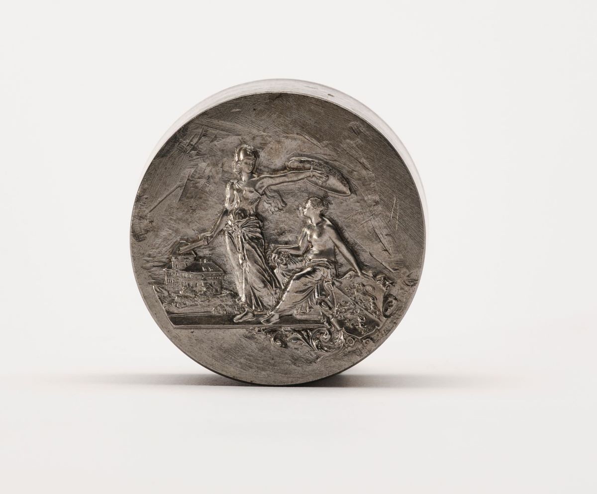 Beim vorliegenden Objekt handelt es sich nicht um den Stempel, mit dem die Medaillen geprägt wurden, sondern um das Werkstück (Patrize) zur Fertigung des Prägestempels. Dank der in der 2. Hälfte des 19. Jhs. erfundenen Reduziermaschine wurde das von einem Künstler geschaffene überdimensionierte Gipsmodell mittels eines mechanischen Prozesses in reduziertem Format auf einen stählernen Prägestock, der Patrize, übertragen. Dank Senkverfahren entstand aus dem erhabenen Bild (Patrize) das Negativbild auf einem weiteren Prägestempel (Matrize), der nach Überarbeitung der Details (Nachgravierung) und Hinzufügen von Schriften als Ober- und Untereisen der Stempelpresse für die Medaillenherstellung diente.
