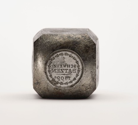Beim vorliegenden Prägestempel handelt es sich um ein Untereisen einer Spindelpresse (Balancier), bei welcher die horizontale Drehbewegung der Hebearme die Gewindespindel mit dem eingesetzten Obereisen senkrecht abgesenkt. In das glatte Metallplättchen (Schröting), das dabei auf dem fixen Untereisen liegt, wird dank dem hohen Druck der sich nach unten bewegenden Gewindespindel das Prägebild der beiden Münzstempel (Ober- und Untereisen) übertragen. Die Spindelpresse kam ab der 2. Hälfte des 17. Jhs. in der Münzprägung auf, bevor neue technische Entwicklungen ab den 1820er-Jahren sie abgelösten.