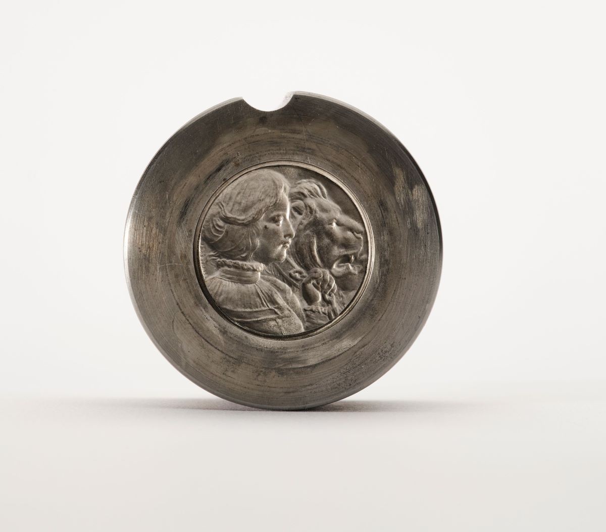 Zylinderförmiger Prägestock mit seitlicher halbrunder Kehlung. In vertieftem Rund sind die beiden hintereinander gestaffelten Brustbilder einer jungen Frau in Renaissancetracht mit plissiertem Hemd und hochgesteckten Haaren sowie eines Löwens mit wallender Mähne und offenem Schlund dargestellt. Mit ihrer erhobenen Hand umschliesst die Frau die Halskette des Löwens (Detail des Frauenfelder Wappens «Fräuli mit Leuli»); hinter dem Kopf der Frau, dem Rund folgend, die Künstlersignatur: «HANS FREI».