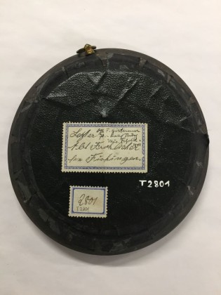 Die Front des Kastens schwarz lackiert (geschrumpft), die Seiten des Kastens konisch nach hinten verjüngt. Die Rückseite mit Textilabdeckung, darüber Klebeetikette mit handgeschriebenen Angaben zum Ankauf und dem Abgebildeten «[?] F. Girtanner / 70.– Kauf Thurg[auisches] Mus[eum] Frauenfeld», «Letzter Abt Fröhlicher von Fischingen.» Runde Öse aus der Zeit für Aufhängung.