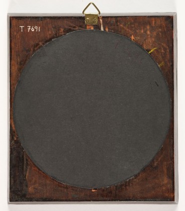 Das Wachsrelief liegt vertieft auf einer runden schwarzen Platte in einem verglasten Holzkasten mit profilierter Rahmung um das Glas.