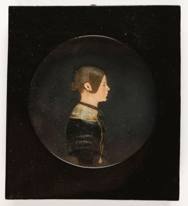Halbfigurenstück im Profil nach rechts, in rundem Ausschnitt. Die Porträtierte trägt aufgrund des glänzend dargestellten Stoffs ein schwarzes Seidenkleid, ein schwarzes Cape mit Fransen und einen darüber liegenden weissen transparenten Kragen mit fein gerüscheltem Rand und weisser Stickerei. Über dem Kragen liegt eng am Hals ein schwarzes Band, gemäss der damaligen Mode vermutlich aus Samt, dessen Enden sich vorne über der Kehle kreuzen, darunter eine goldene Brosche mit grünem Stein. Das braune Haar ist von einem Ohr zum anderen gescheitelt und von dort horizontal nach hinten gekämmt und am Hinterkopf zu einem Knoten aus einem Zopf hochgesteckt. Am Vorderkopf ist es mittelgescheitelt, liegt glatt auf und vertikal in Strähnen frisiert, die bis zur Mitte ihrer Wange reichen und dort in einem Bogen unter dem Ohr zum Hinterkopf verlaufen und in einer Schnecke enden. Um den Hals eine lange Uhrkette mit runder Taschenuhr mit Karabiner auf höhe der Taille.